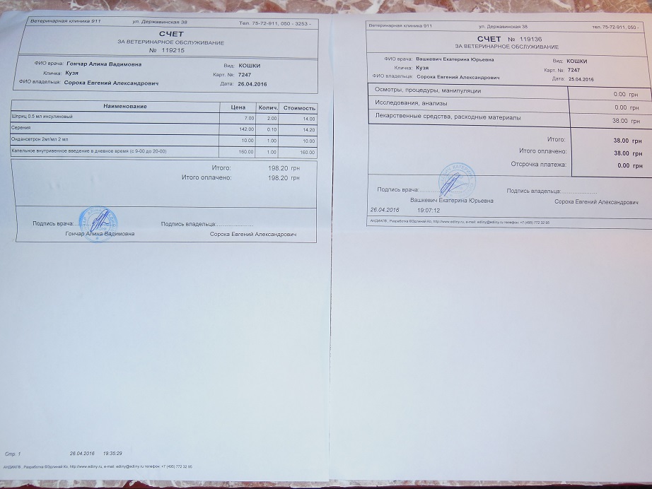 Кузенька с утра умер...перестал дышать около 8 утра, откачивали 15 минут. Врач в шоке, ничего не предвещало, хотел сегодня его выписывать! Сделали вскрытие-все органы, кроме почек, в порядке (сердце, легкие), вируса и глистов нет. Но и в почках не такие уж несовместимые с жизнью изменения...! Ничего реально не предвещало. мы рыдаем о потере!((( прикладываю последний счет. и еще заказала кремацию в КП "ЦОЖ" за 158 грн., забирать самой и хоронить нет душевных сил, очень больно! Завтра рассчитаюсь в клинике и приложу последнюю квитанцию.