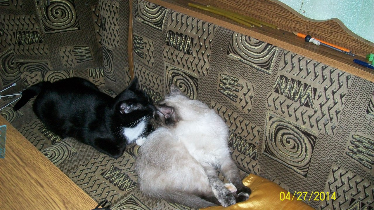 "Здравствуйте, Марина! Дела у нас очень хорошо. Норочка уже совсем освоилась. Поправилась на 200 г. Хорошо кушает и много спит. У нее исчез испуг в глазках и она уже начинает потихоньку играться. С Васькой они то дружат, то дерутся. Хотя, может это у них игра такая. Спят они со мной в постели вдвоем, даже муж уже привык к кошачьему семейству, хотя котов он не сильно любит. А когда приходит сын, то Нора идет к нему, а Вася остается со мной. Единственно, что мне не нравится, это ее шов после операции, она все время его разлизывает и там уплотнение. Как только погода позволит поедем к врачу. А вообще, она девочка очень хорошая, ласковая, очень спокойная как для сиамки."