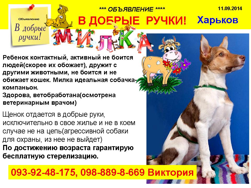 Спасибо всем огромное за помощь в пристройстве! Мы нашли для девочки замечательную семью, которая любит и обожает нашу Милку у девочки за 2 недели появилось свое место-лежанка, пара комбинизончиков, поводочки, ремешочки и куча игрушек. Плюс ею занимаются, она уже выучила несколько команд, до этого мы ее научили только команде "Сидеть", в общем развитие ребенка в ответсвенных ручках)) =))))))