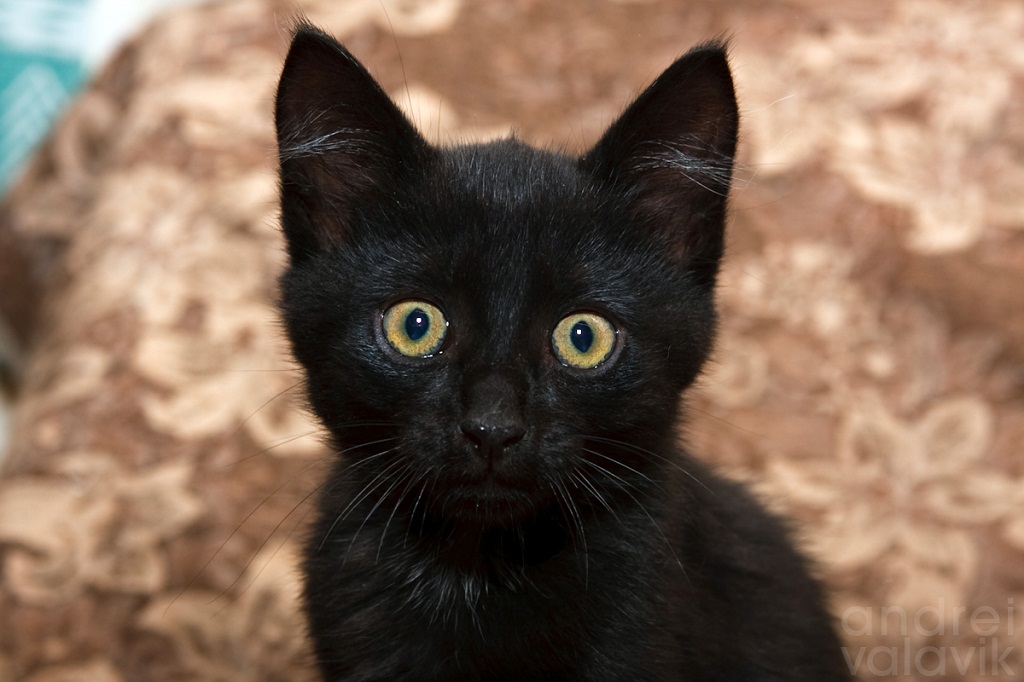Забрел к нам во двор очень милый черный котенок с желтыми глазами. На вид-3 месяца ему, не больше.