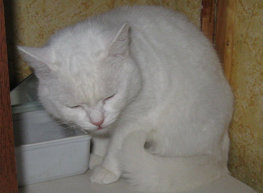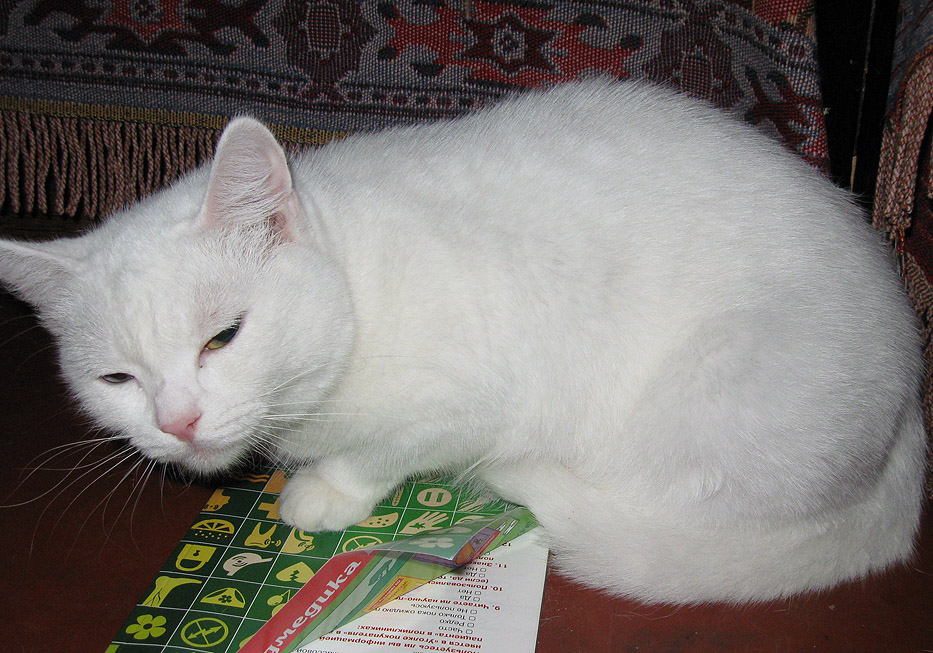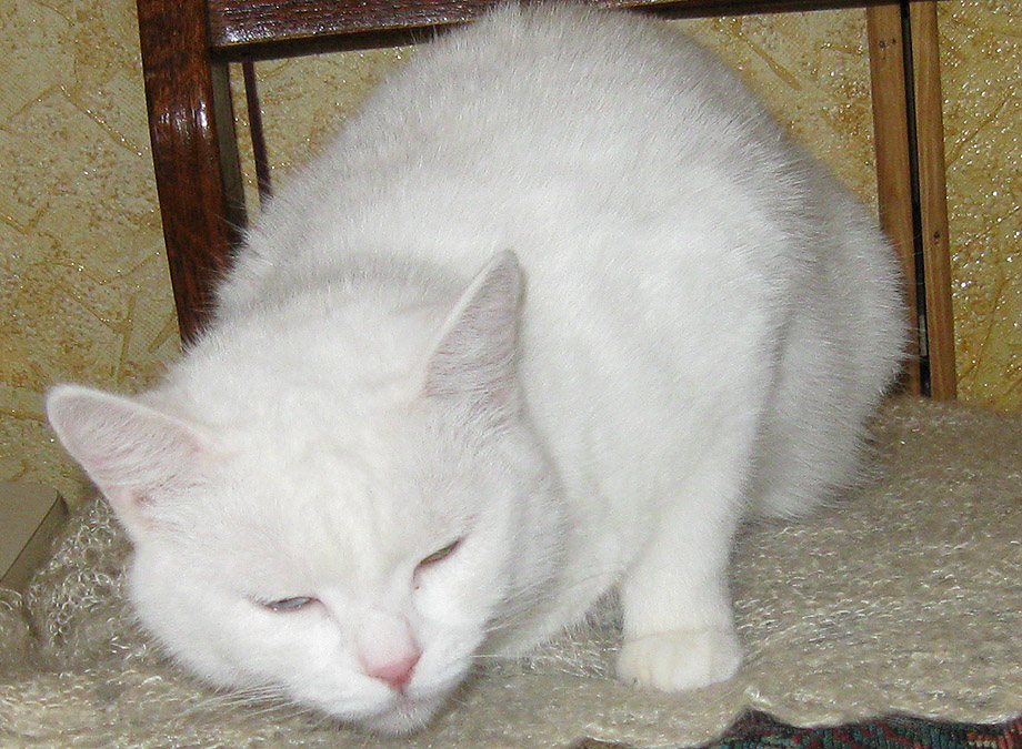 Кошка, 2г. Окрас белый, кругленькая, упитанная, короткошерстная, шерсть плюшевая, как у британцев. Разноглазая-один глаз жёлтый, а второй-голубой. Стерилизована.