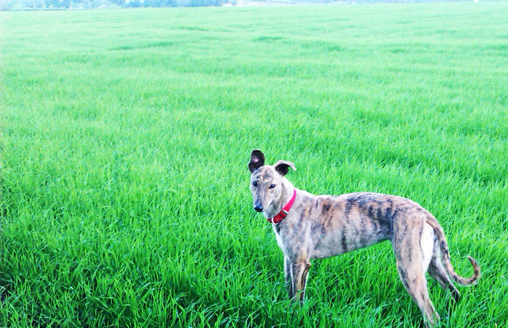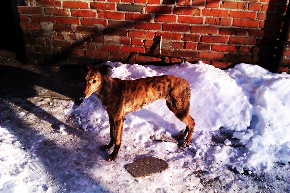 Сегодня ,02.02.2014 года была найдена в полях ,возле Малой Рогани сука (молодая) хортой борзой тигрового окраса . Собака находится у меня дома.Есть фотографии.