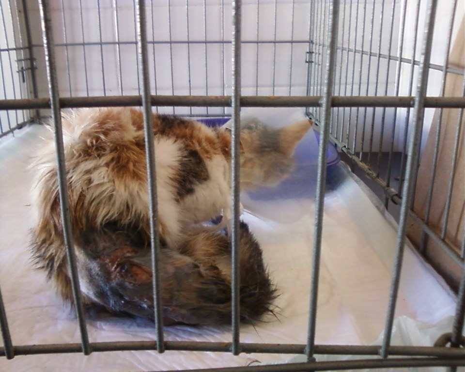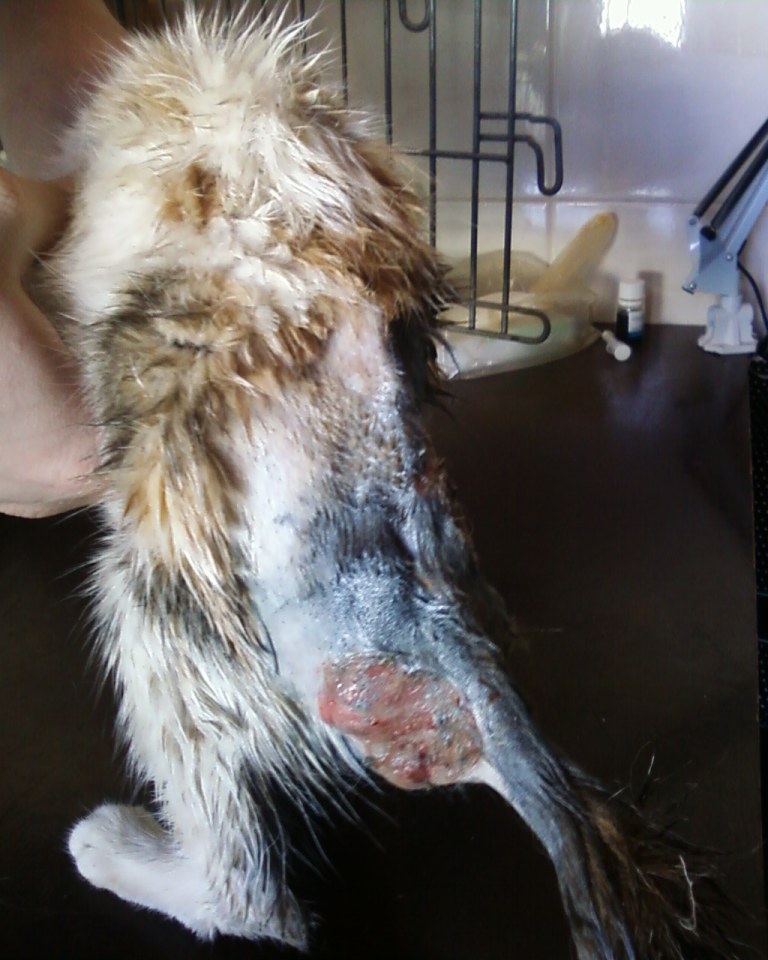Итак имеем. Кошечка Лайза, покусанная собаками с некрозом тканей, ушным клещом и отитом. Сильное обезвоживание. Ходячий скелет. Вместе с воротником весит 1150. Возраст примерно 4 месяца.