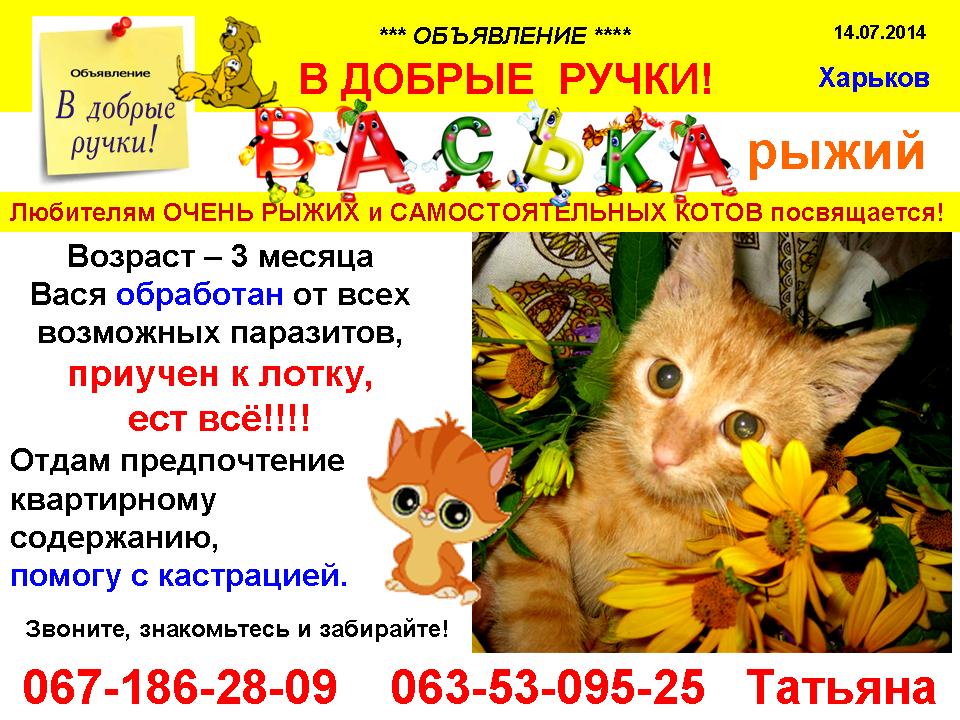 Любителям очень рыжих очень самостоятельных котов посвящается эта тема! Звоните, знакомьтесь и забирайте! Вася обработан от всех возможных паразитов, приучен к лотку, ест всё!!!! Отдам предпочтение квартирному содержанию, помогу с кастрацией!