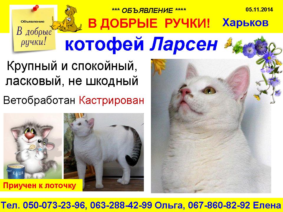 Ларсен - крупный и спокойный кот, ласковый, не шкодный.