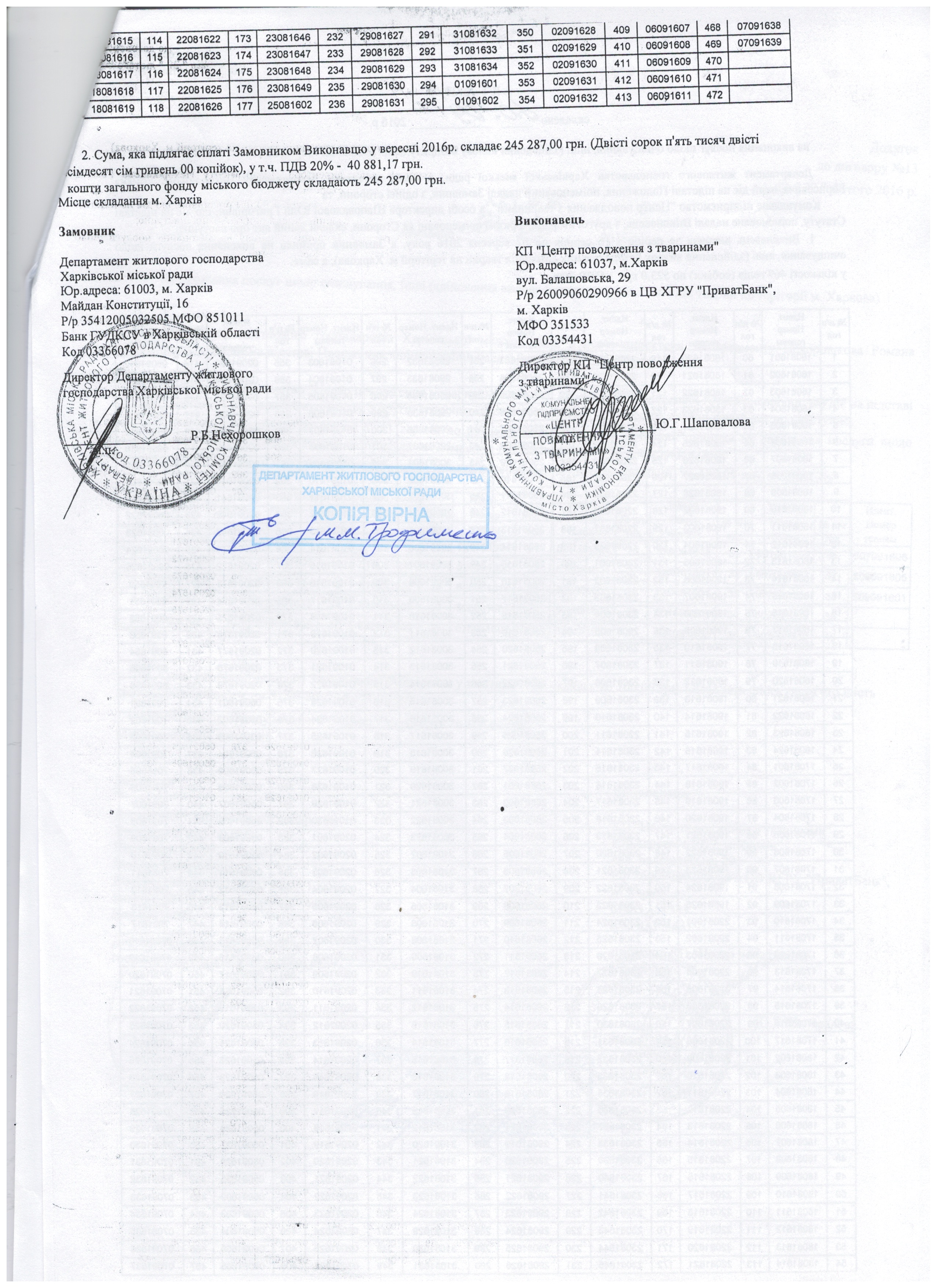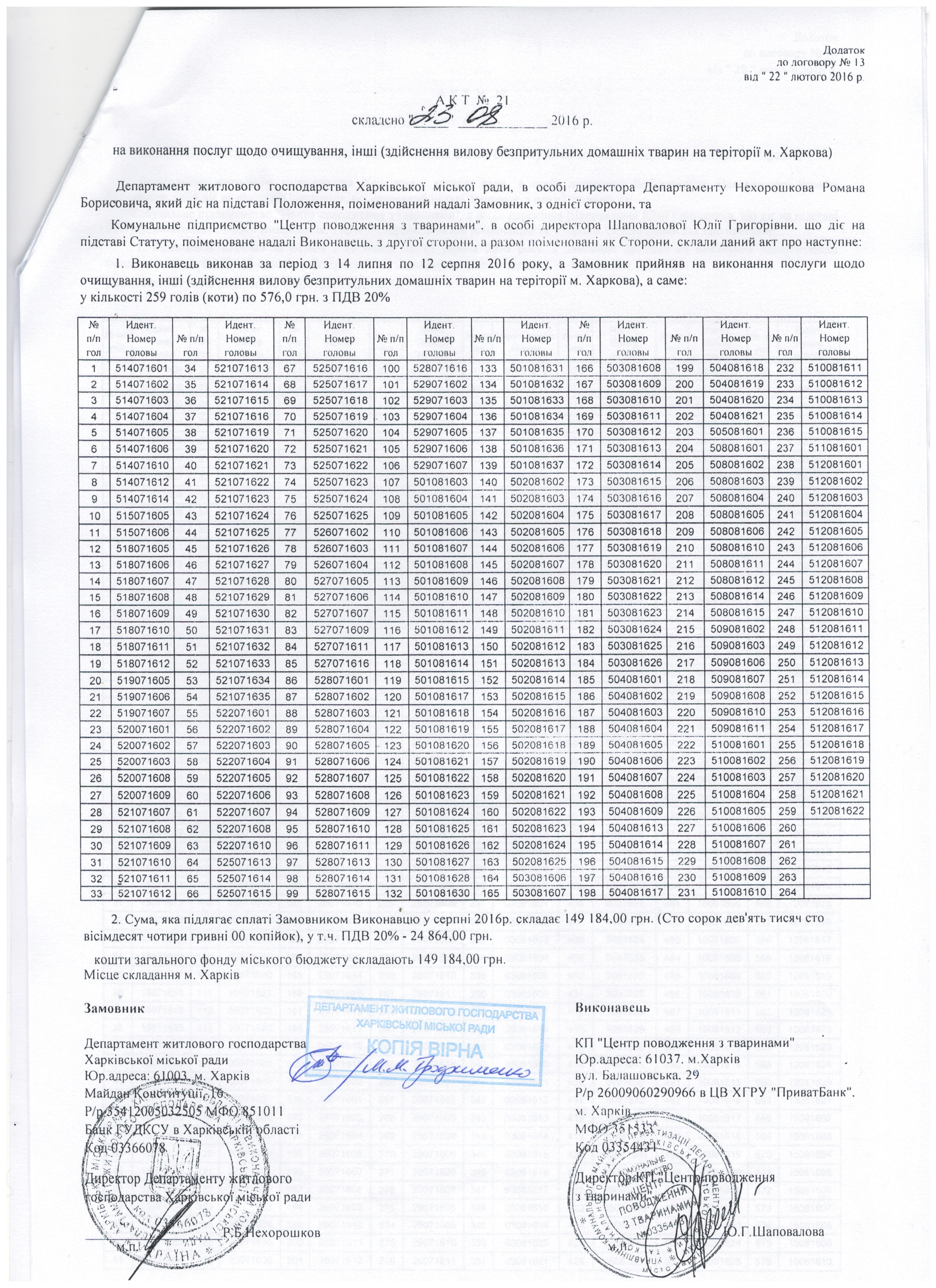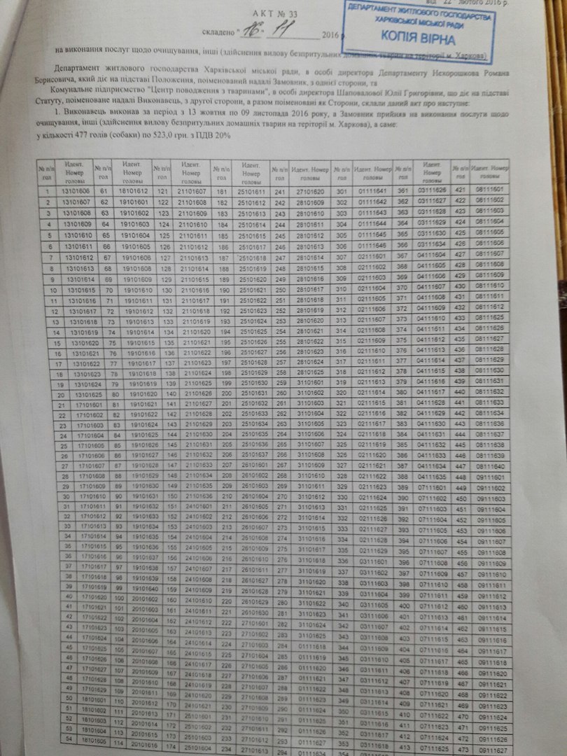 Договор на очистку города от бродячих животных на 2016 год между КП "Центр обращения с животными" и Департаментом жилищного хозяйства Харьковского городского совета, а также Акты приёма выполненных работ (по отлову животных на улицах Харькова). Каждый номер - это жизнь, за ним - отловленное живодёрами и убитое в КП "ЦОЖ" животное.