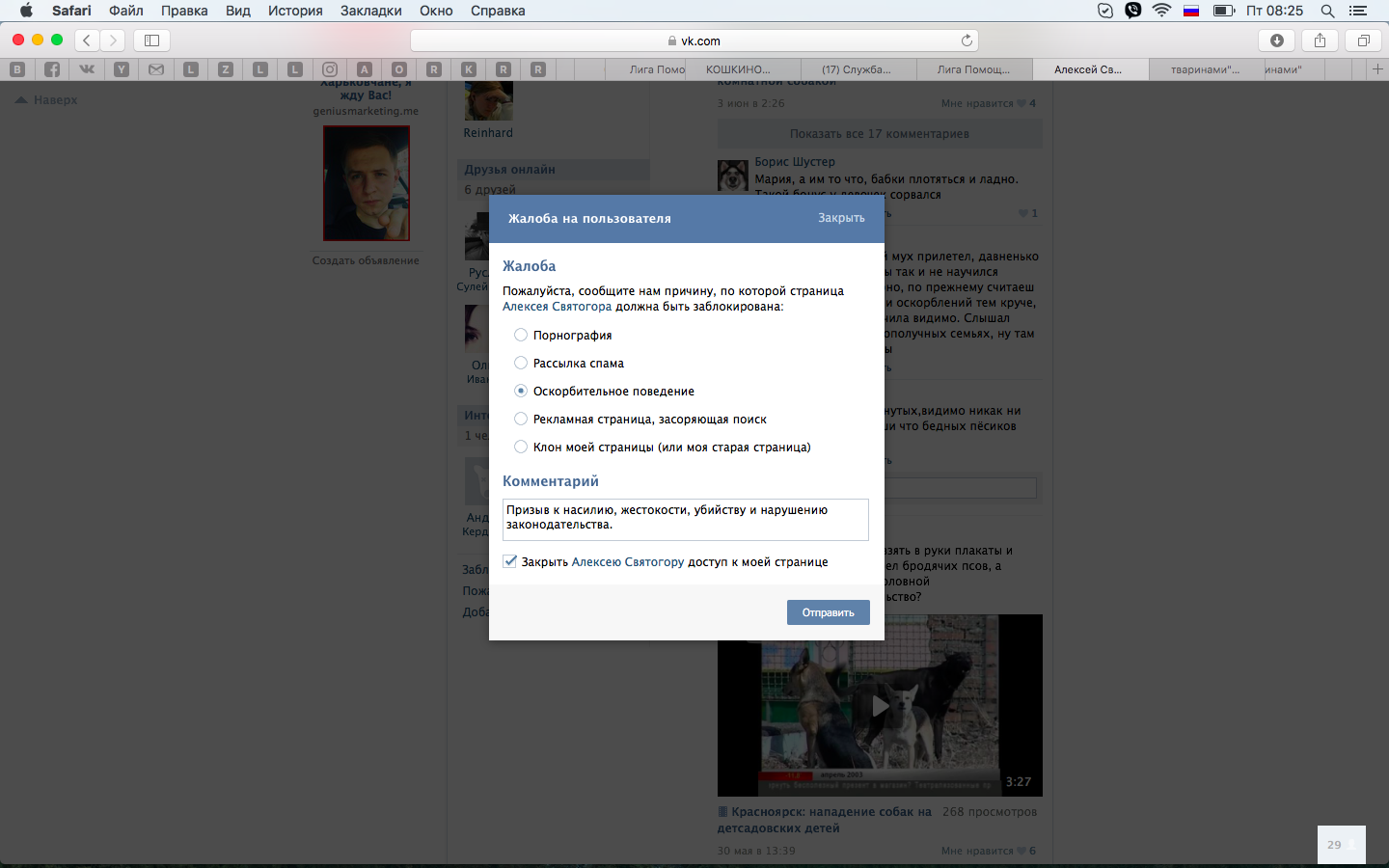 Да, там из предложенных вариантов только "Оскорбительное поведение". В комментарии я написала: "Призыв к насилию, жестокости, убийству и нарушению законодательства"