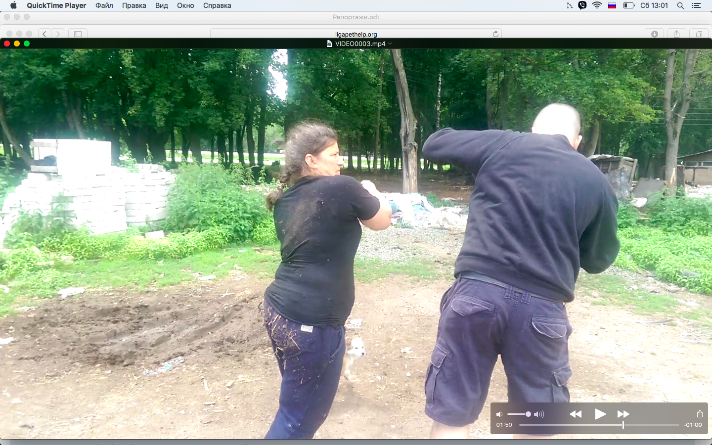 Когда мы подошли ближе, я сказала Таранченко, что слышала о том, что здесь находится конно-спортивный комплекс «Аллюр» и спросила можно ли покататься на лошадке. Она ответила, что это стоит 150 грн.в час. Я сказала, что дороговато... Она спросила, что мы здесь делаем и что высматриваем и крикнула: «Пошли на х.. отсюда». Саша включил видеокамеру на телефоне, и сказал, что мы пришли посмотреть на состояние животных и условия их содержания. Таранченко кинулась на Сашу и выбила у него телефон из рук. Телефон упал на землю, Саша поднял телефон и успел заснять мгновение, когда она внезапно схватила булыжник и кинула в Зою