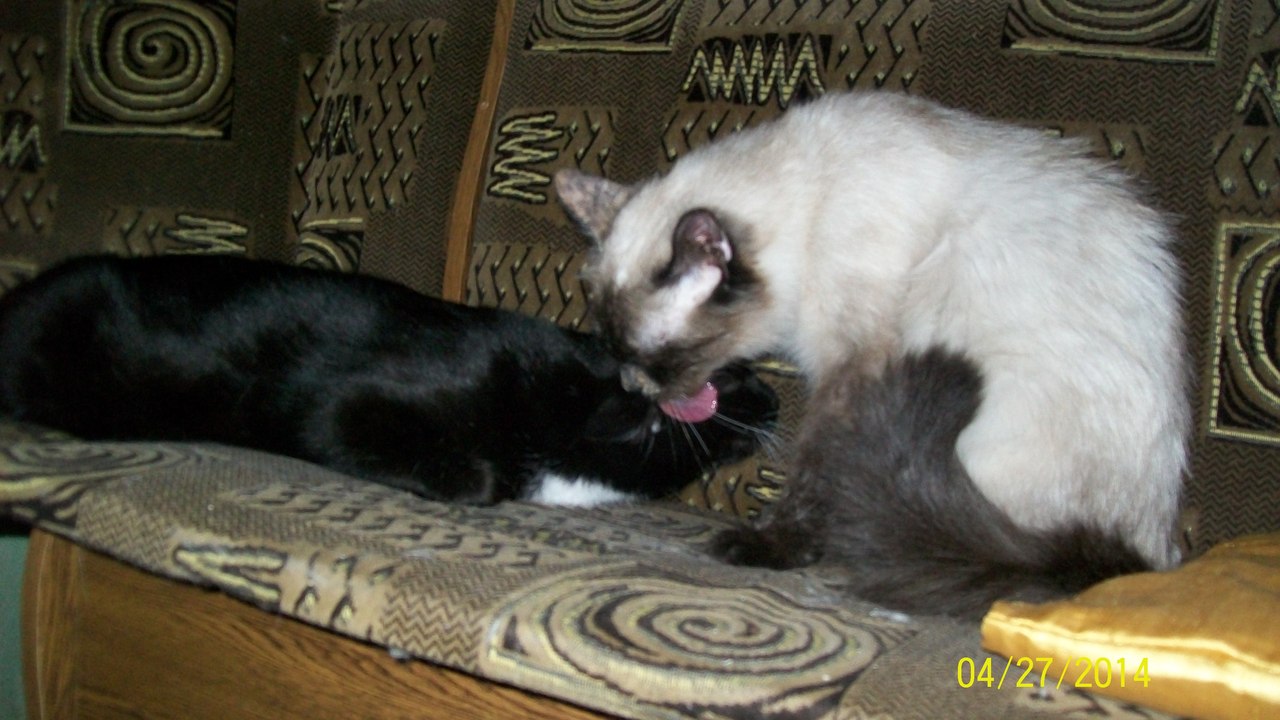"Здравствуйте, Марина! Дела у нас очень хорошо. Норочка уже совсем освоилась. Поправилась на 200 г. Хорошо кушает и много спит. У нее исчез испуг в глазках и она уже начинает потихоньку играться. С Васькой они то дружат, то дерутся. Хотя, может это у них игра такая. Спят они со мной в постели вдвоем, даже муж уже привык к кошачьему семейству, хотя котов он не сильно любит. А когда приходит сын, то Нора идет к нему, а Вася остается со мной. Единственно, что мне не нравится, это ее шов после операции, она все время его разлизывает и там уплотнение. Как только погода позволит поедем к врачу. А вообще, она девочка очень хорошая, ласковая, очень спокойная как для сиамки."