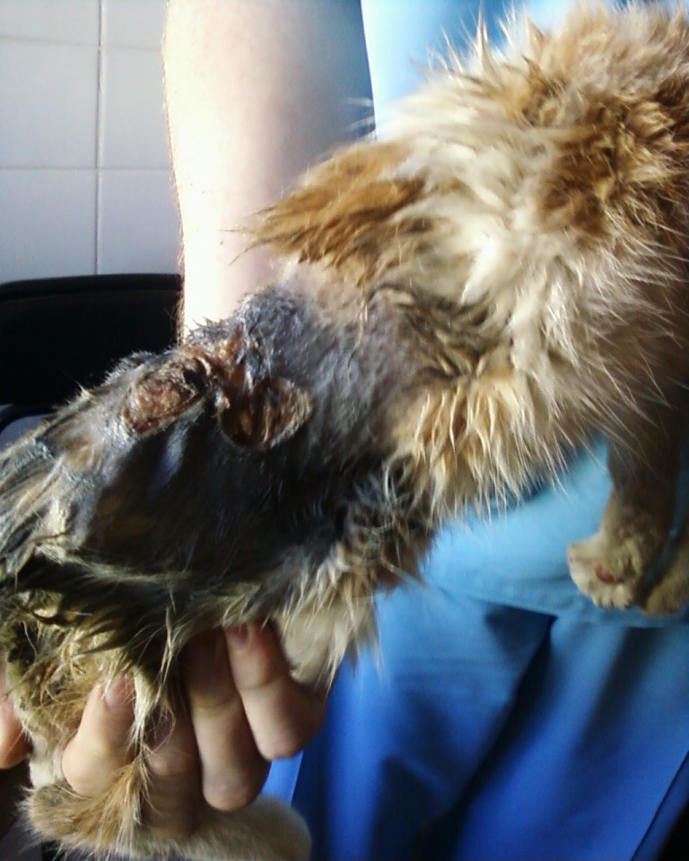 Итак имеем. Кошечка Лайза, покусанная собаками с некрозом тканей, ушным клещом и отитом. Сильное обезвоживание. Ходячий скелет. Вместе с воротником весит 1150. Возраст примерно 4 месяца.