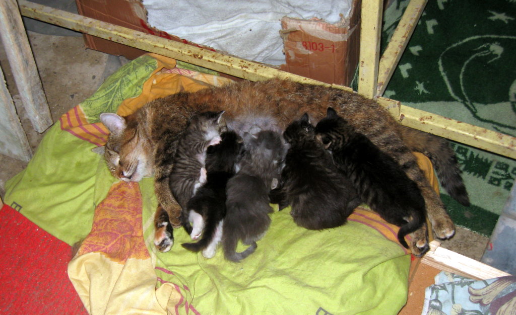 У подобранной нами кошечки с новорожденными котятами сейчас 10 котят (4 родных и 6 ей подложили). Родным котятам 20 апреля исполнится уже месяц. Срочно ищем им хозяев, потому что у кошки уже не хватает молока кормить всех десятерых.