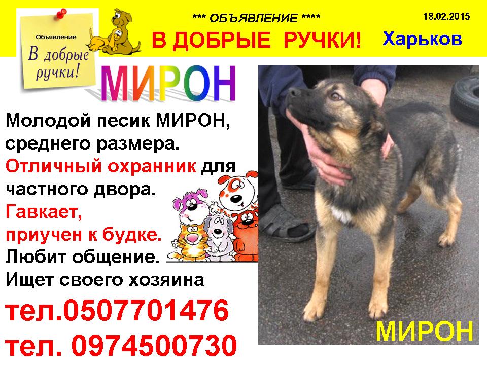 Я случайно попала в этот двор, была там, пристраивая свою собаку. А меня попросили помочь пристроить Мирона. Я выдала льготный талон на стерилизацию их маленькой собачки, которая является мамой Мирона. Собачку уже простерилизовали. А вот Мирона так и не хотят себе оставлять, вплоть до того, что открыто мне говорит, что звонков нет и он не собирается долго ждать. Этакие деревенские жлобы, которые не хотят ничего делать, даже приучить собаку к цепи, как я ему советовала. Ему проще собаку завезти. :facepalm: