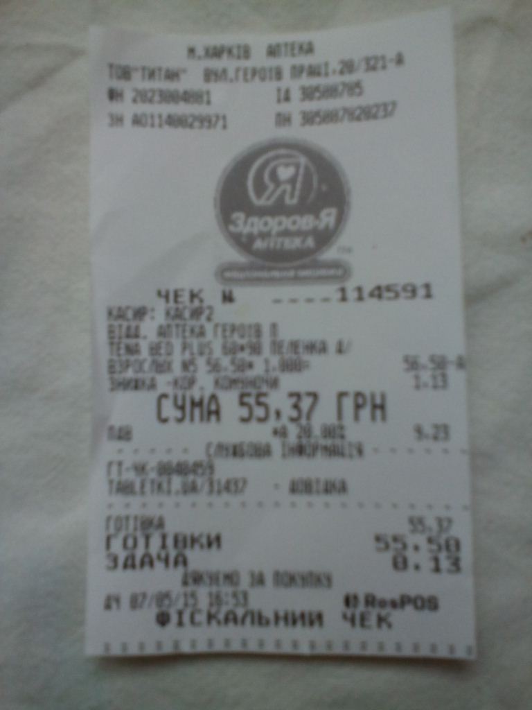 покупка пеленок и медпрепаратов для реабилитации - 421,28 гривен