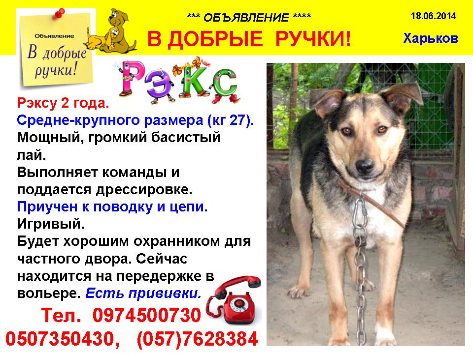 Харьков. Сейчас Рэкс ищет хорошего, настоящего хозяина. Рэксу 1,5 года. Среднего размера (кг20). Хорошо, громко лает. Выполняет некоторые команды и поддается дрессировке. Приучен к поводку. Игривый. Будет хорошим другом и охранником для частного двора. Сейчас находится на передержке в вольере.