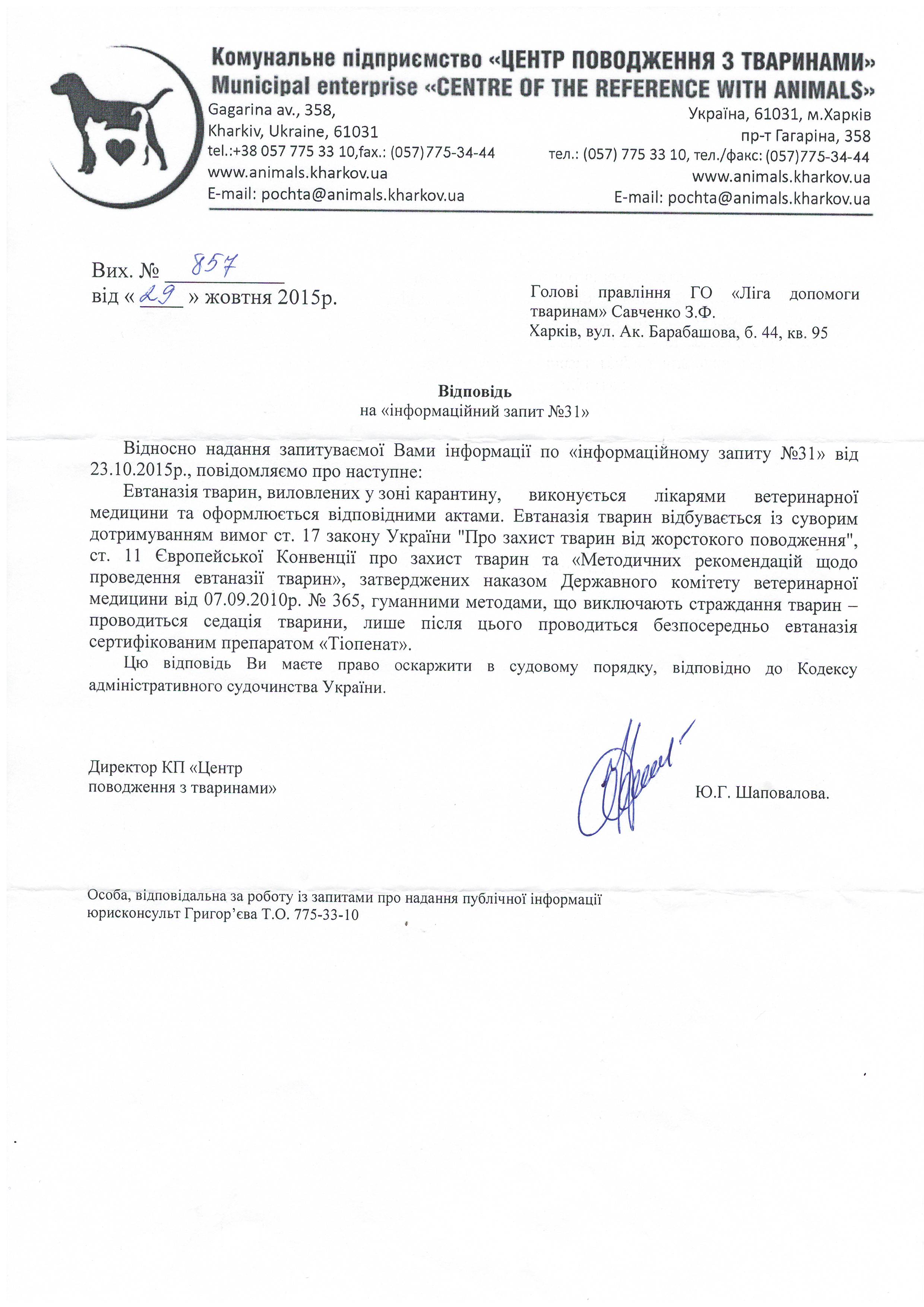 2) Надати інформацію про кількість безпритульних котів, яких стерилізувало КП «ЦПзТ» за 2009-2014р.р. та І півріччя 2015р. не представляється можливим, оскільки ні діючим законодавством України, ні галузевими або регіональними актами накопичення та систематизації таких даних не передбачено.» Звісно така відповідь містить неправдиві відомості і порушує діюче Українське законодавство, оскільки вся діяльність підприємств, і гопрозрахункова і бюджетна підлягає звітності, яка складається на основі накопичення та систематизації в тому числі і таких даних.