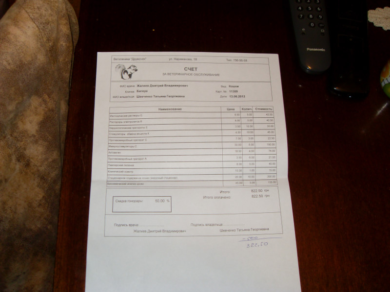 Выкладываю фото чека и фото Багирочки по просьбе опекуна Татьяны, т. к у нее проблемы с загрузкой фотографий! Багирочку уже выписали! Подробности напишет опекун.
