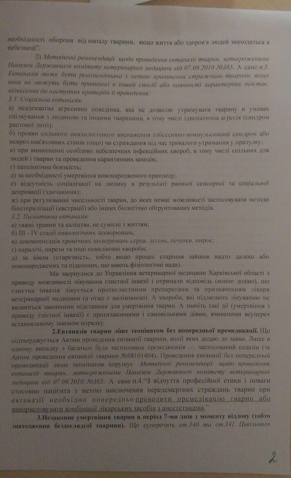 Также мы подали заявление на директора КП "ЦОЖ" Шаповалову Ю.Г. по факту незаконной эвтаназии животных и умышленного уничтожения чужого имущества.