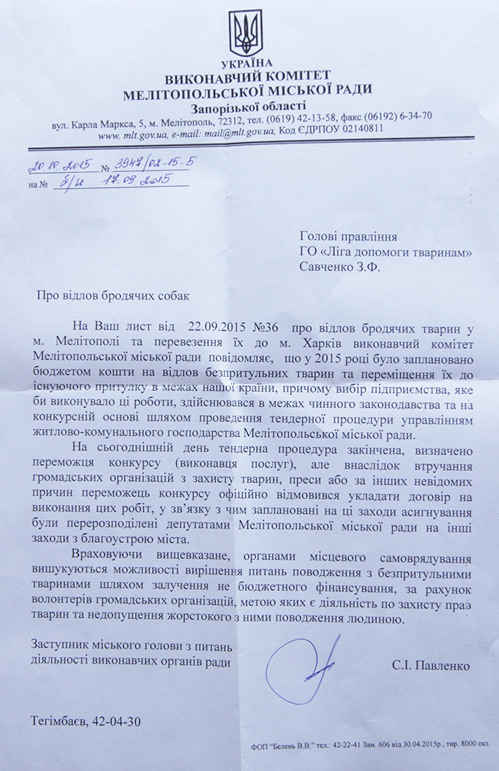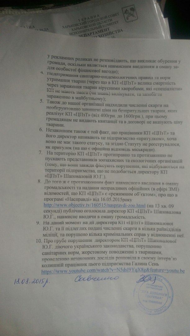 19.11.2015 р. ГО "Ліга допомоги тваринам", ГО "Зоозахисне об'єднання "Разом" та ХБОЗТ "Центр усиновлення тварин" подали Звернення на ім'я Голови Комітету з питань екологічної політики, природокористування та ліквідації наслідків Чорнобильської катастрофи Томенко М.В.