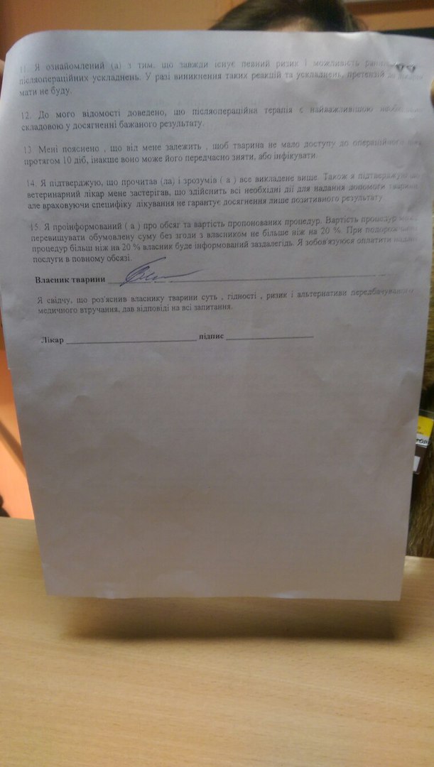 Я встретилась с этим Романом Ивановичем. Там же был и хирург, который проводил операции. Человек с помятой внешностью и перегаром. Они вместе убеждали нас, что зазор в костях и не срастающаяся лапа - это так задумано "специалистом"-хирургом. И отказались возвращать предоплату за неудачную операцию. Вот договор, который нам показали и который подписывала Вера Ивановна перед операцией Багиры. Клиника вообще ни за что не отвечает. И не гарантирует не только результат операции но и выжываемость животного тоже.Отличная отмазка для опытов неумёх...