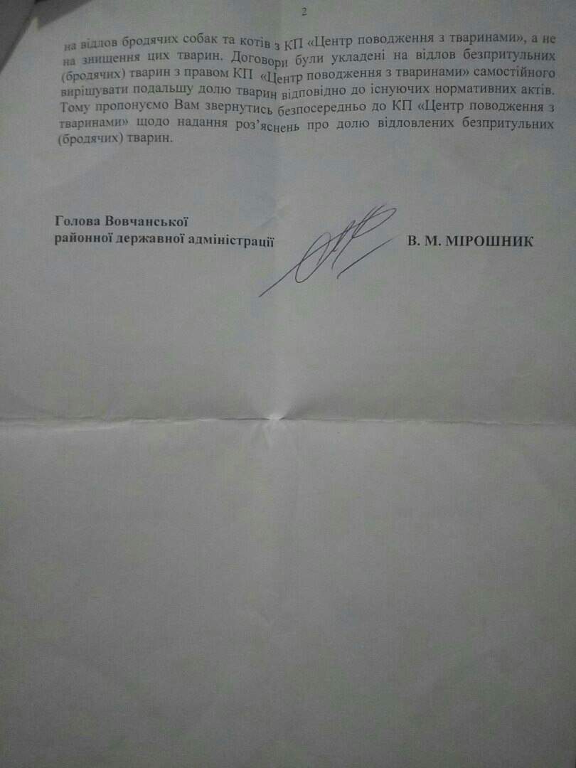 Ми звернулися до голови Дружківської міської ради з запитом на публічну інформацію, попрохавши Договір та Акти виконаних робіт (оскільки інформація стосується розпорядження бюджетними коштами). У вказаному Договорі не зазначена адреса карантинного майданчика, куди повинні відправляти відловлених собак, згідно Закону України “Про захист тварин від жорстокого поводження”. Також адміністрація населених пунктів не повідомляє жителів про майбутній вилові собак, які є особистою власністю громадян. Не вживає ніяких заходів до пошуку власників загублених тварин, які потрапили у відлов, всупереч ст.340 ЦК України. Саме тому умови договору порушують права громадян — власників загублених тварин, які повинні утримуватися (знаходитися на відповідальному зберіганні) особи, яка знайшла (відловила) загублену тварину не менше 2-х місяців.