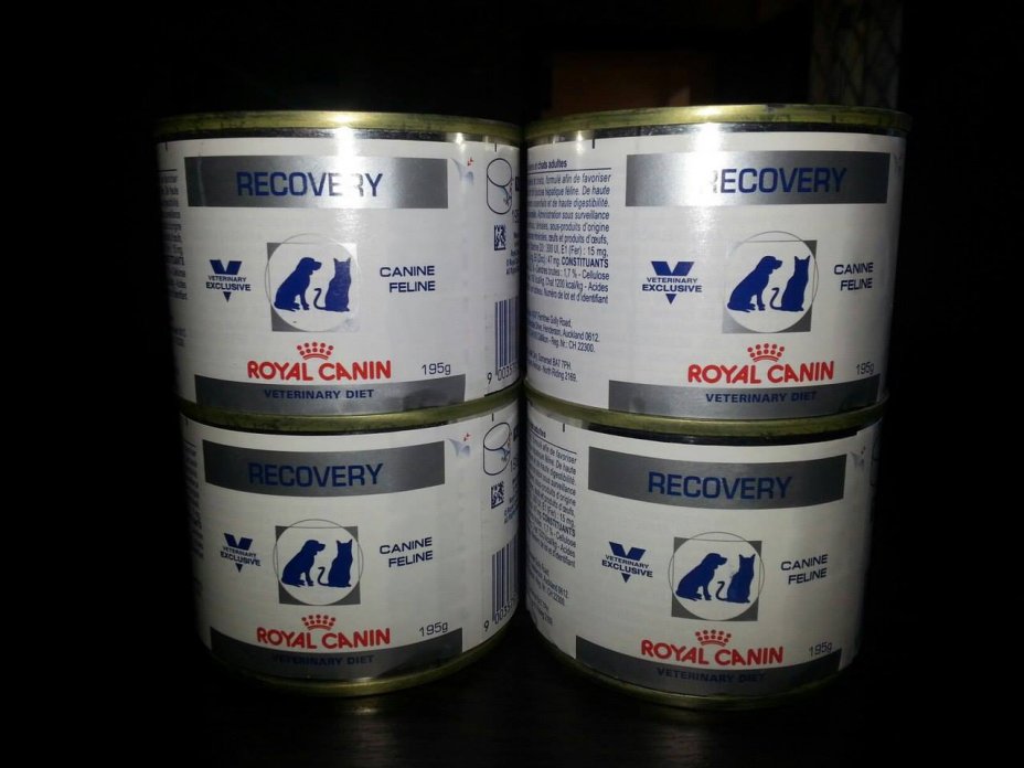 Сейчас Печеньку кормят дробно - часто и маленькими порциями. Для скорейшего выздоровления купили ей сегодня паштетики "Royal Canin Recovery".