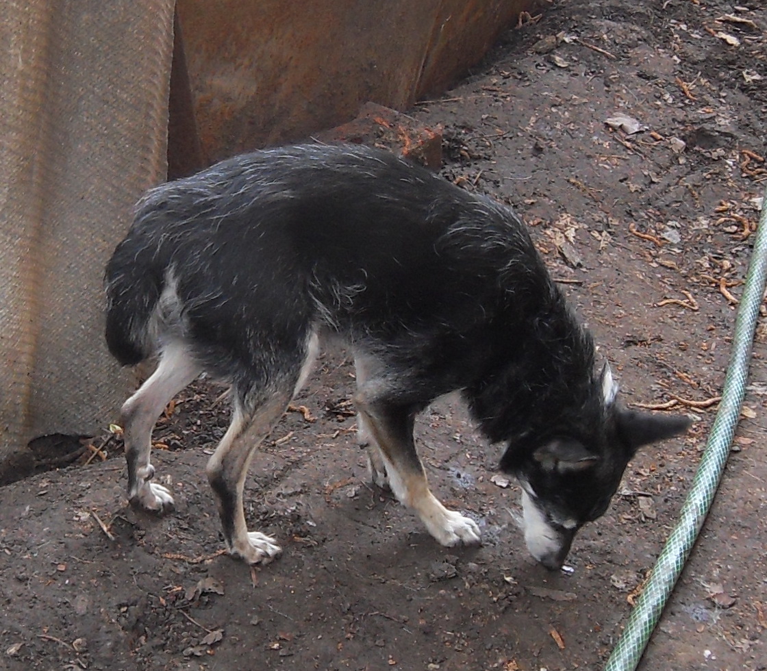Цвет черный-серый-немного белого. Уши стоят. Хвост короткий, купирован. Тип шерсти – обычная. Боится машин, выстрелов салюта, людей. Был черный ошейник от блох.