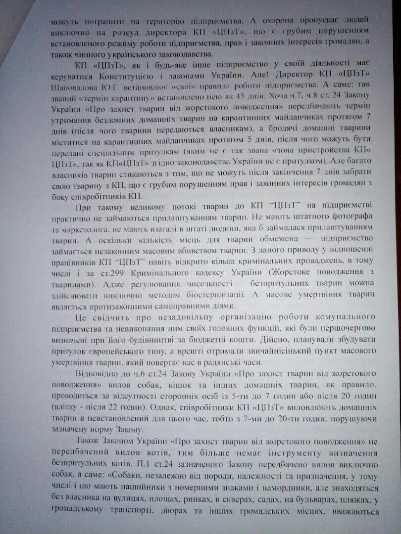 Підводячи підсумок, хочемо звернути Вашу увагу, що безповоротний вилов (з подальшою евтаназією) тварин, який застосовує КП «ЦПзТ» є протизаконним та негуманним, оскільки Законом України «Про захист тварин від жорстокого поводження» передбачено регулювання чисельності домашніх тварин (до яких за визначенням належать коти та собаки) методом стерилізації, а не евтаназії.