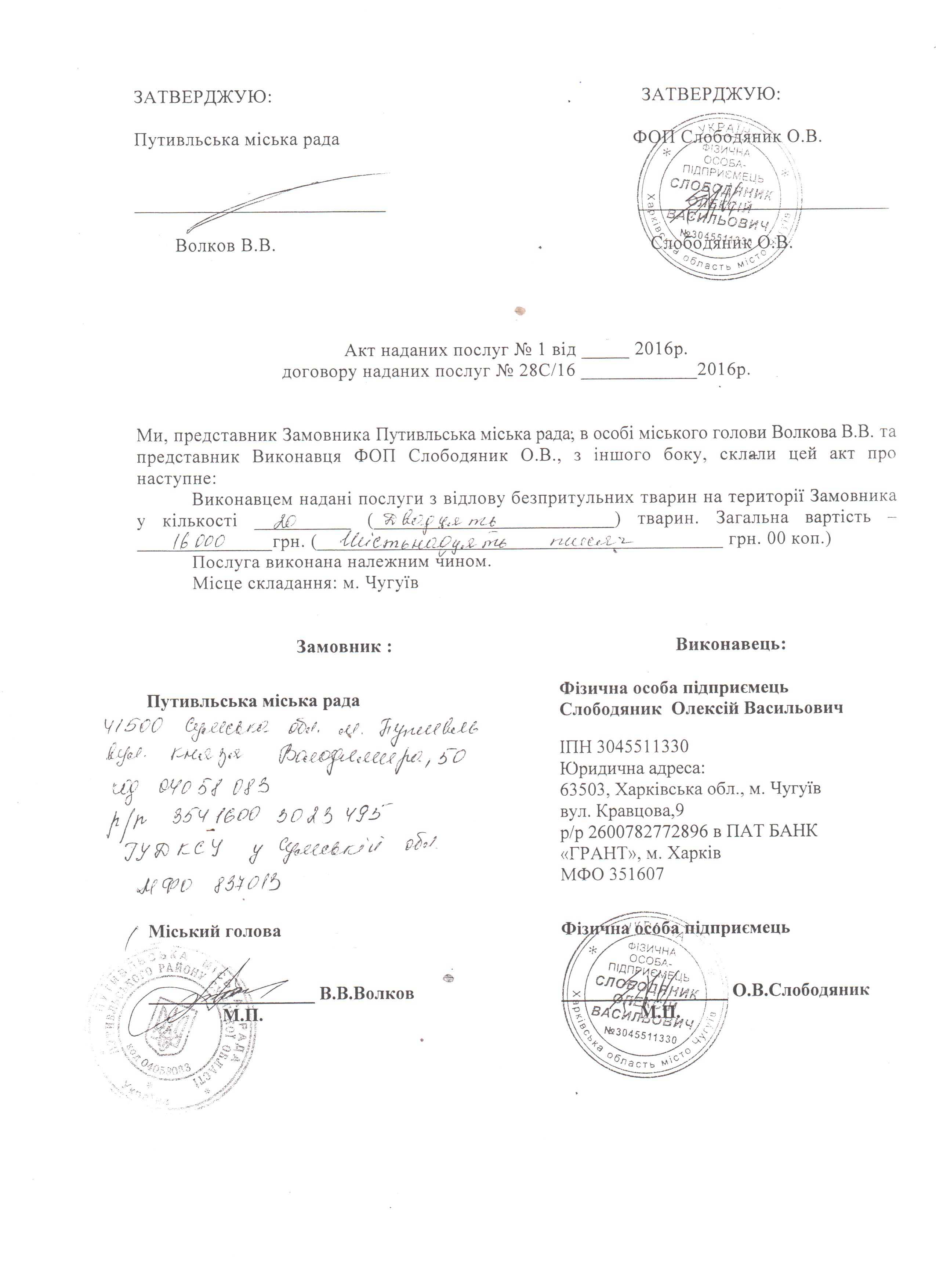 Громадській організації «Ліга допомоги тваринам» стало відомо, що Вовчанська міська рада підписала договір №26 від 31 жовтня 2016 р. на вилов безпритульних тварин в м.Вовчанськ з комунальним підприємством “Центр поводження з тваринами”, який, відповідно до свого Статуту проводить діяльність виключно в межах міста Харкова. До Звернення додаю копію Статуту КП “Центр поводження з тваринами” в якому чітко зазначені межі діяльності підприємства — м.Харків. Що підтверджує неправомірність дій КП “ЦПзТ” по укладанню з Вовчанською міськрадою договору на вилов тварин у м.Вовчанськ. З даного приводу нами буде подана заява до поліції з вимогою відкрити кримінальне провадження та притягнути директора КП “ЦПзТ” Ю. Шаповалову до кримінальної відповідальності.