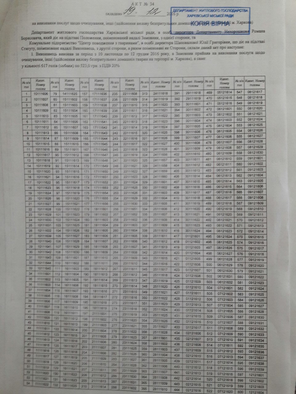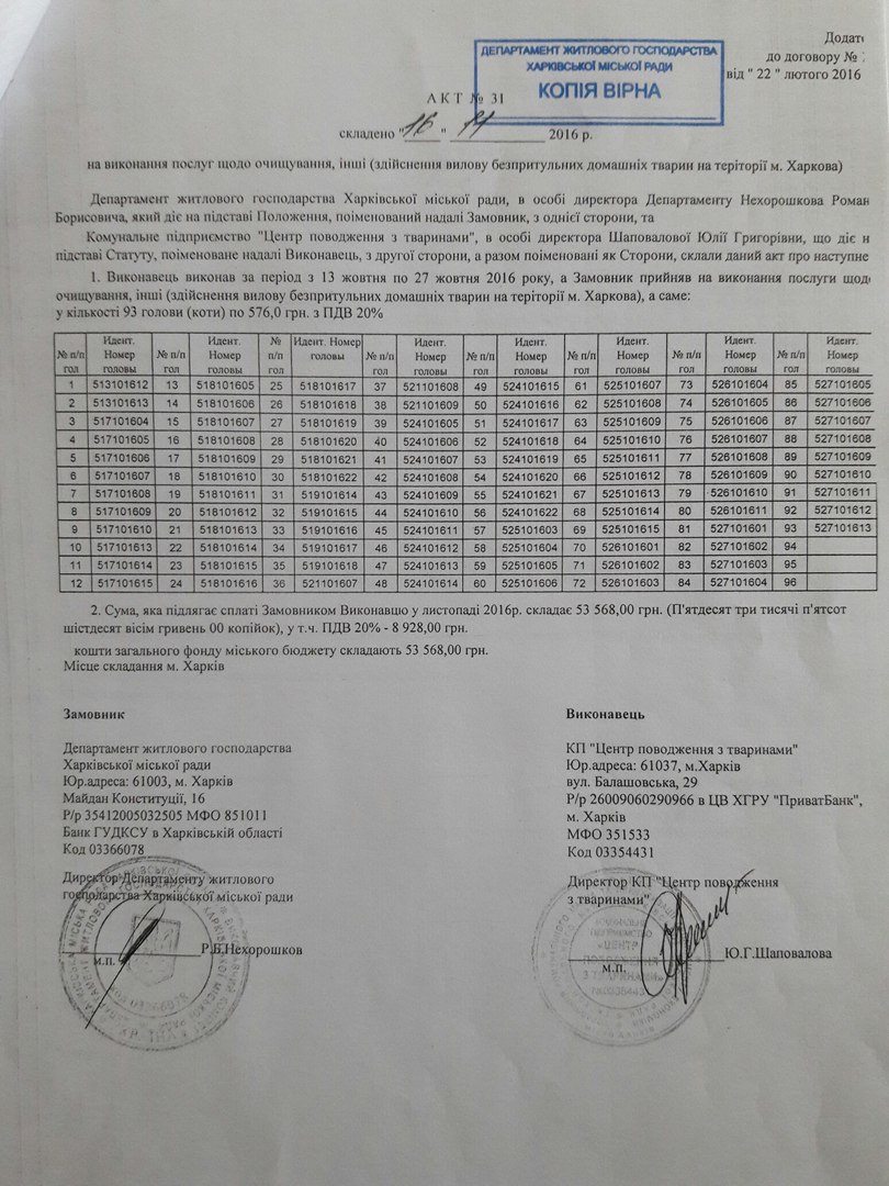 Договор на очистку города от бродячих животных на 2016 год между КП "Центр обращения с животными" и Департаментом жилищного хозяйства Харьковского городского совета, а также Акты приёма выполненных работ (по отлову животных на улицах Харькова). Каждый номер - это жизнь, за ним - отловленное живодёрами и убитое в КП "ЦОЖ" животное.