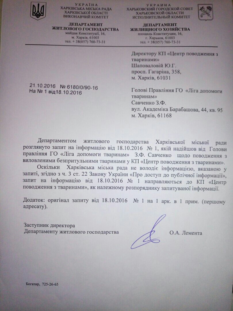 Также подали запрос в Харьковский горсовет по поводу финансирования КП "ЦОЖ" в 2016 году, строительства колумбария, а также попросили дать копии актов выполненных работ между Департаментом жилищного хозяйства Харьковского горсовета и КП "ЦОЖ" (по отлову).