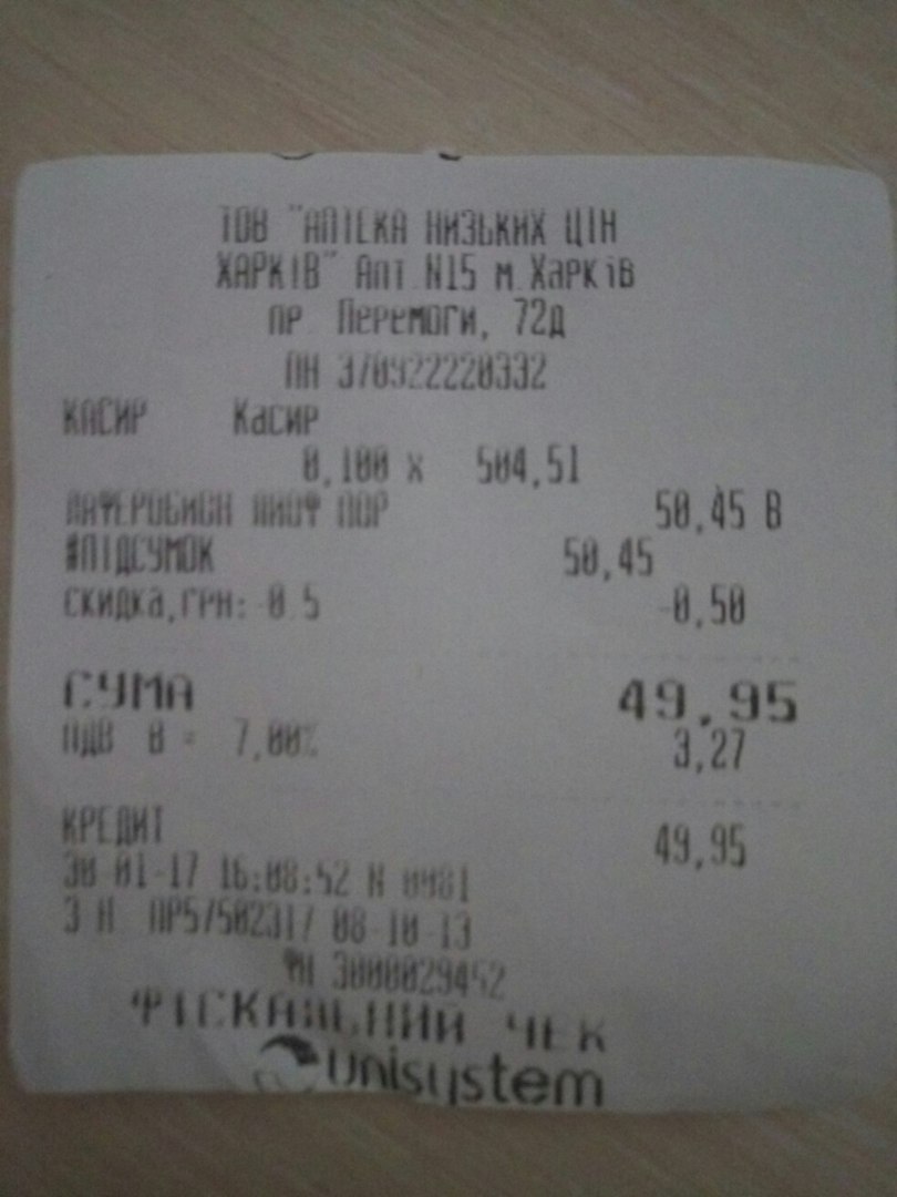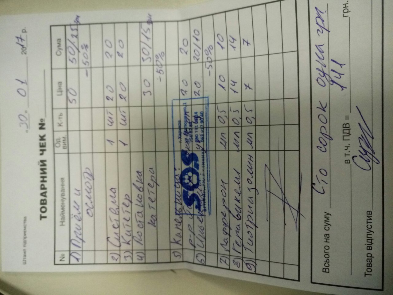 Итого за лечение и лекарства: 482,55грн. (по чекам)