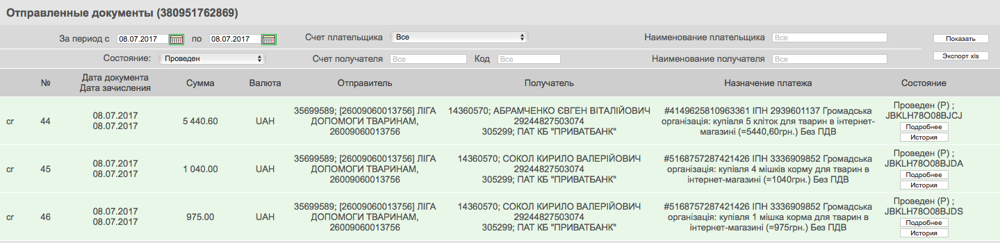 Также Лига закупила 1 клетку "Лори" = 535грн. (07.07.17) и 5 клеток Trixie (78х62х55) скан с банка ниже (08.07.17)