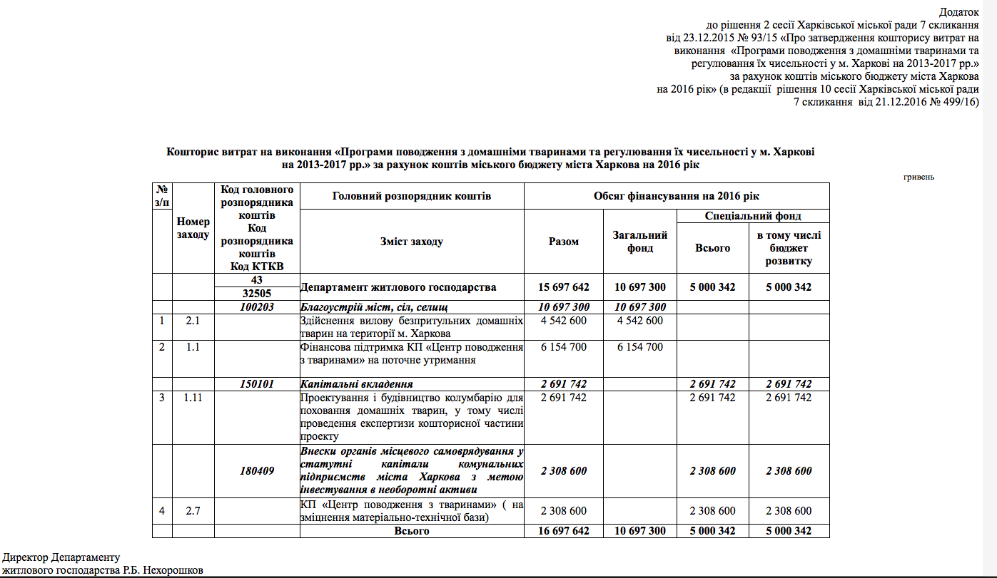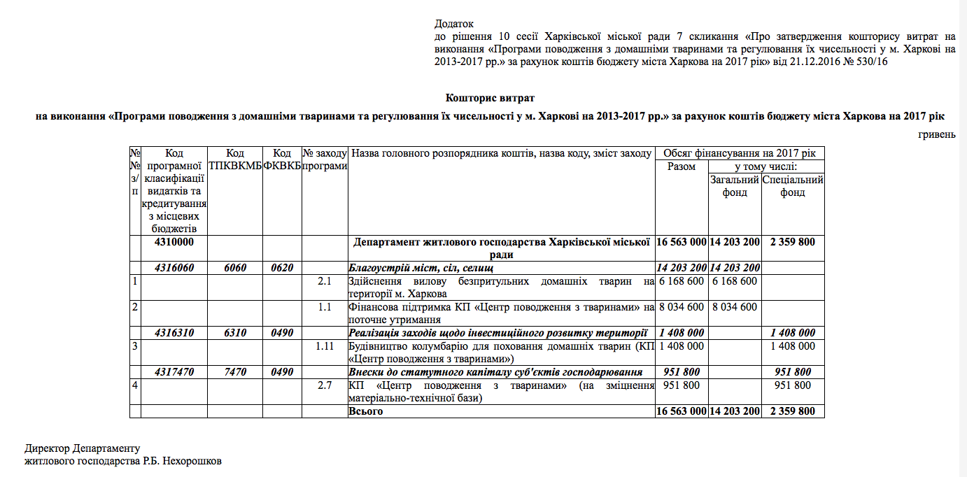 Фінансування з бюджету м.Харкова комунального підприємства "Центр поводження з тваринами". А також фінансування будівництва неіснуючого притулку в м.Харків.